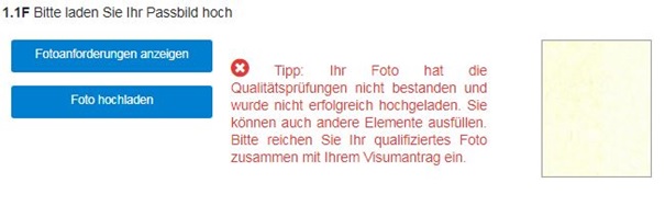 Das Online-System der Visastellen ist so angelegt, dass es die Kriterien an das Foto automatisch prüft und ggf. eine Fehlermeldung erscheint, wenn es diesen Kriterien laut Online-Prüfung nicht 100% entspricht. Das heißt aber nicht gleichzeitig, dass die Visastelle es nicht akzeptiert.